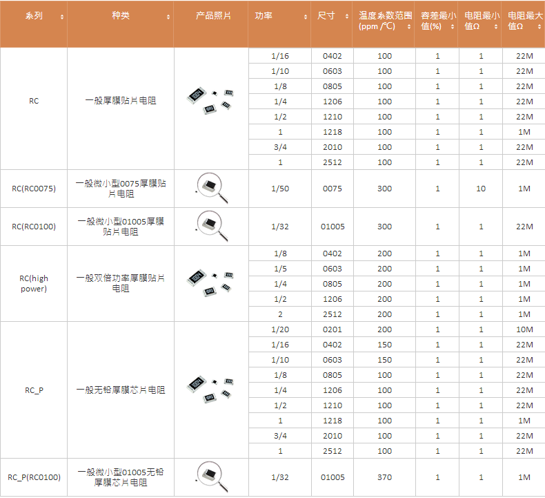國(guó)巨RC系列厚膜電阻包括了:常規(guī)厚膜電阻、小型0075厚膜貼片電阻、小型01005厚膜貼片電阻、大功率厚膜貼片電阻、無(wú)鉛厚膜貼片電阻。