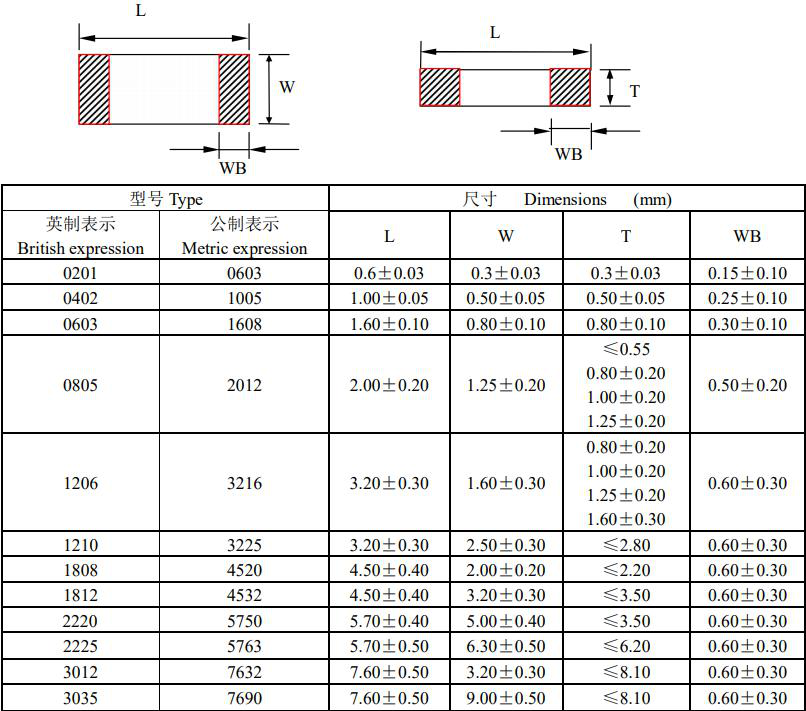 風(fēng)華MLCC陶瓷貼片電容結(jié)構(gòu)尺寸圖如下